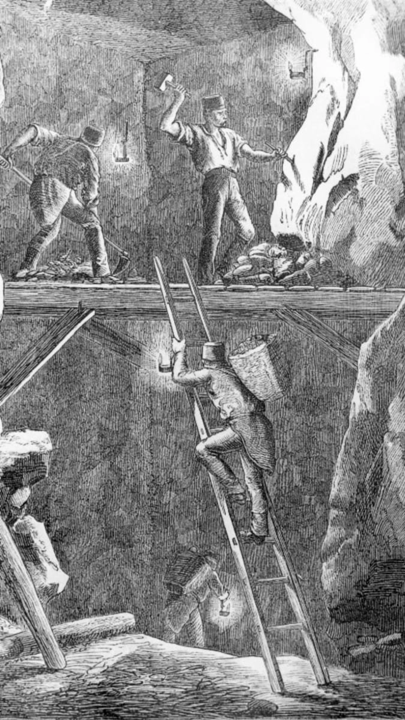 Zastávka popisující techniky ražby důlních děl v historii hornictví.