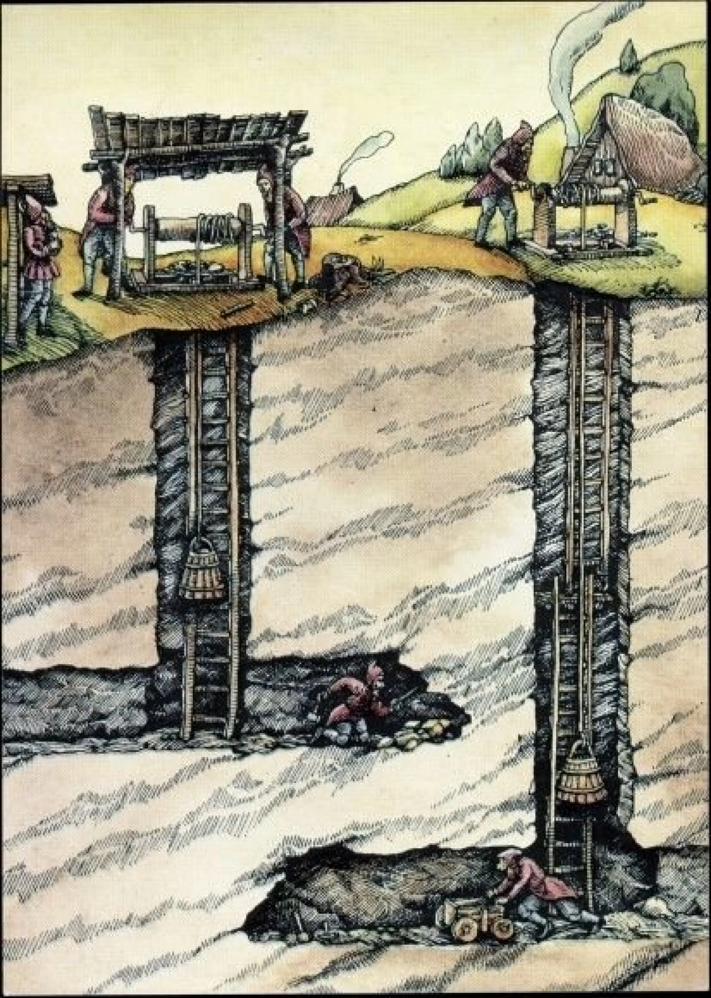 Hlubinné dobývání v českých zemích započalo na přelomu 13. a 14. století. Otvírka ložiska se dělala kombinací svislých nebo úklonných jam a štol. Způsob jejich rozmístění byl dán průběhem a morfologií ložiska a velikostí dolových měr.